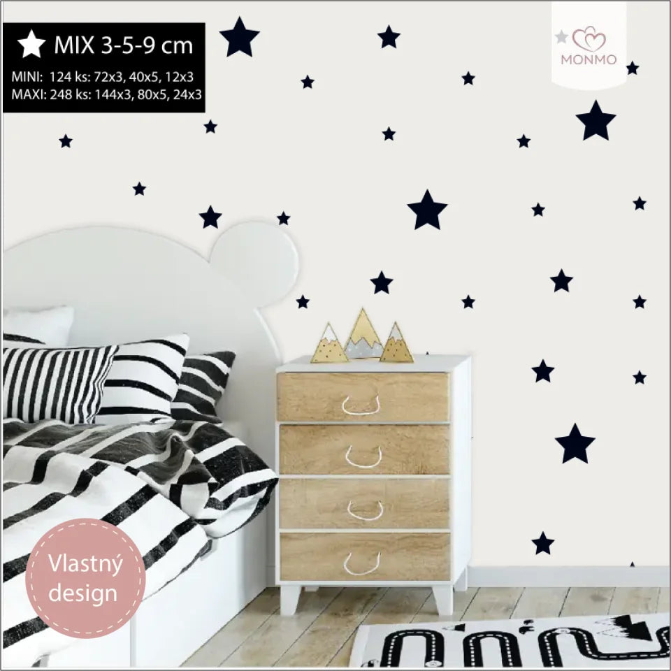 Na výber máš Mini a Maxi sadu: Maxi sada obsahuje dvojnásobný počet nálepiek ako Mini sada. K dispozícii sú rôzne veľkosti, takže si môžeš priestor vyzdobiť presne podľa svojich predstáv.